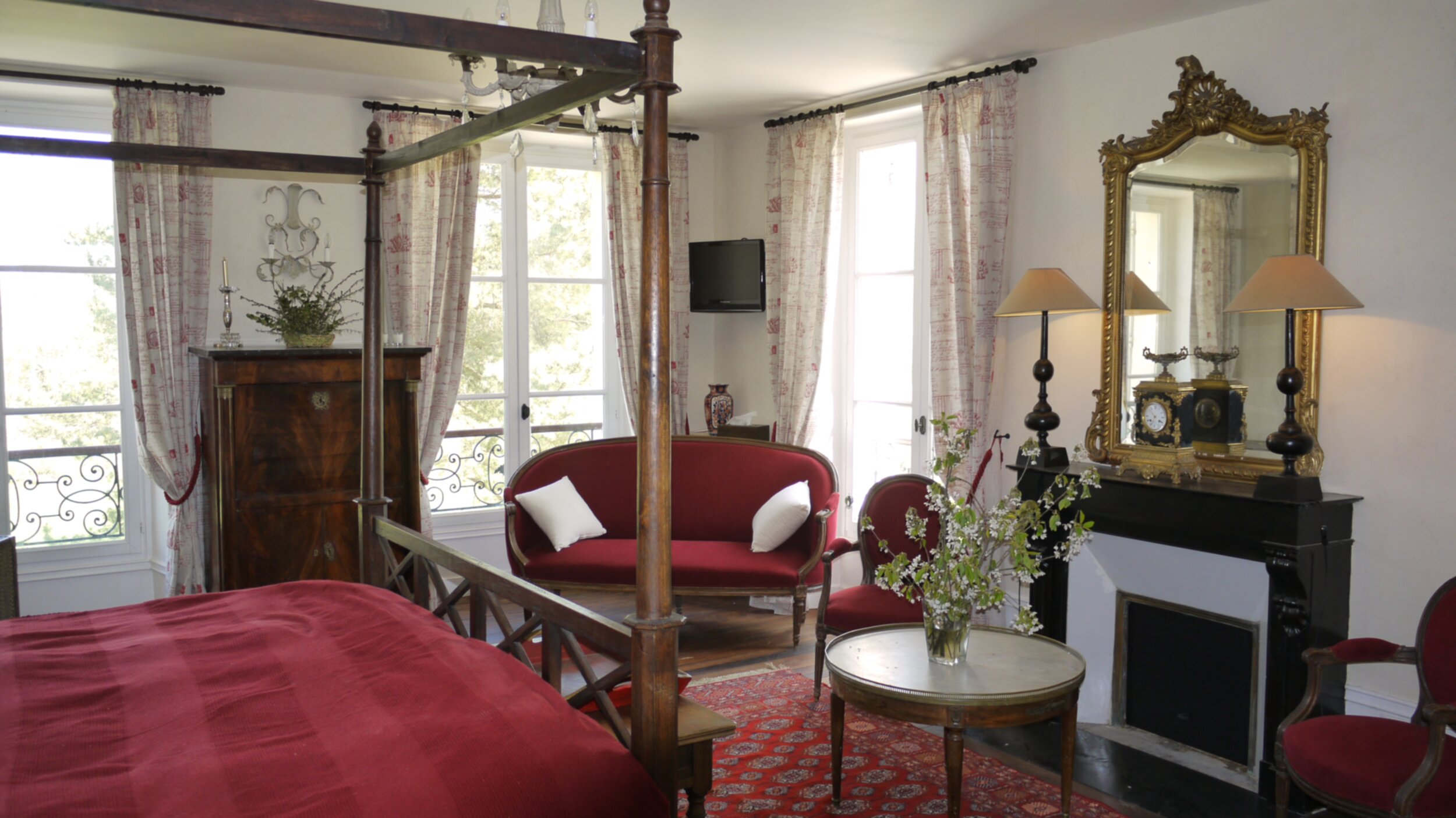 La chambre “Général Huerne” est située au premier étage de la demeure principale, avec un grand lit double en 180x200. Elle donne sur une salle de douche en pierre avec meuble double vasques et toilettes privatives.